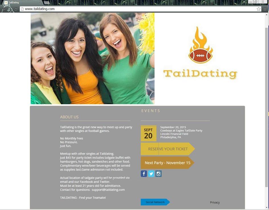 According to the company's specimen, which shows the trademark being used in commerce, the service appears to combine tailgating and dating. For a flat rate, taildaters can access the TailDating area, enjoy a tailgate buffet, and an open bar while supplies last. Not a bad idea.